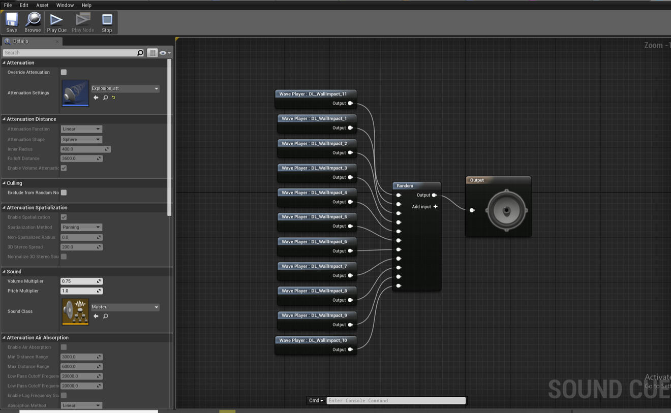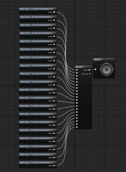 Here are 2 examples of the sounds envelops, where a randomizer is placed to make sure each time a sound event is triggered the same sound isn't played over and over.These were then attached to an either an event (I.e robots being shot) or an animation (I.e footsteps)